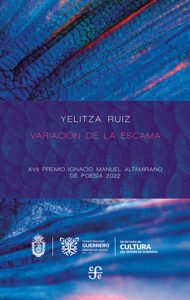 En Variación de la escama —obra ganadora del XVII Premio Ignacio Manuel Altamirano de poesía en 2022—, la mar, la mujer y el linaje son temas que se unen por medio del agua como elemento de creación y de sustento de la vida. La poesía de Yelitza Ruiz muestra dos entes en similitud y advierte una relación estrecha entre la vida marina y la condición humana en sus diferentes etapas y percepciones.
