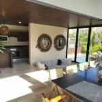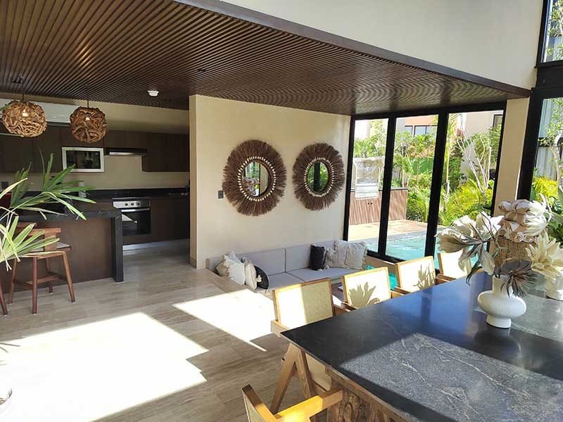 También cuentan con un amplio comedor, cocineta por si buscas prepararte algo especial, sala de estar con una vista de pecera a la alberca privada, la cual siempre está climatizada y está instalada estratégicamente para ser el centro de atención para reuniones o parrilladas.