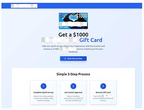 Por ejemplo, investigadores Kaspersky identificaron recientemente una página de phishing que imitaba a una reconocida empresa de venta de entradas. El sitio atraía a los visitantes con una oferta tentadora: completar una breve encuesta para recibir una tarjeta de regalo de mil dólares. Para “reclamar” el premio, se pedía a las víctimas pagar una pequeña comisión. Sin embargo, tras realizar el pago, los usuarios no recibían ni el premio prometido ni la devolución de su dinero, quedando desprotegidos y expuestos a más fraudes.