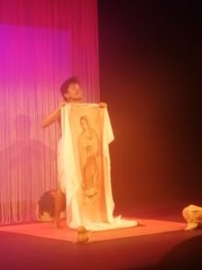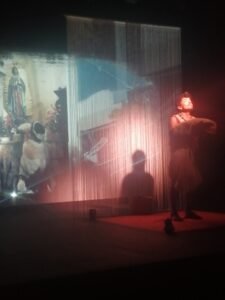 En el sencillo escenario de la Sala Xavier Villaurrutia del Centro Cultural del Bosque (INBAL), tan solo apoyado por una pantalla gigante y utensilios fabricados exprofeso para la obra, el actor se desenvuelve con naturalidad y un cierto respeto ante la imagen adorada.